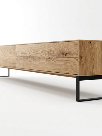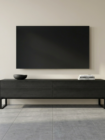 Es una pieza de alta gama que redefine el lujo a través de la sobriedad. Con un acabado negro profundo que deja entrever la textura natural de la madera, esta consola aporta una elegancia arquitectónica y un carácter rotundo a cualquier espacio social. Su diseño de gran formato es ideal para televisores de generosas dimensiones o como pieza de apoyo principal en salones sofisticados.