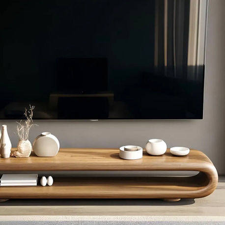 Esta consola de TV es una pieza de diseño vanguardista que combina la funcionalidad con una estética moderna y orgánica. Su forma avalada y su acabado en madera natural la convierten en el punto focal de cualquier espacio.