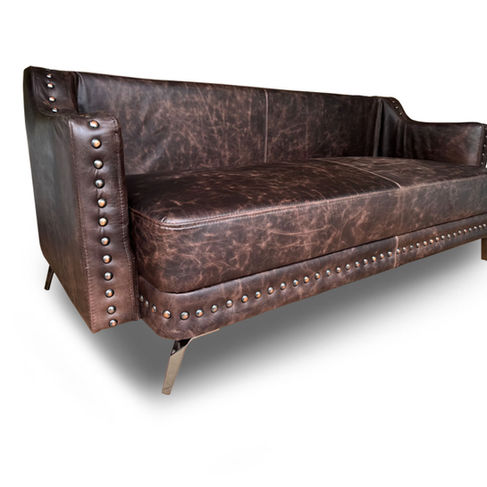 Este sofá no teme ser el centro de atención. Sus brazos y la base están adornados con una hilera de estoperoles, un detalle que le da un toque sofisticado y robusto, ideal para un estilo industrial o rústico. A pesar de su imponente presencia, las patas delgadas y de metal brillante le dan un toque moderno y lo hacen visualmente más ligero.